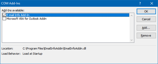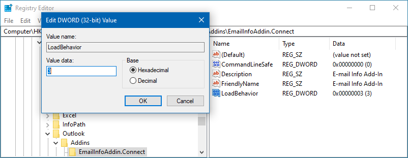 HKEY_CURRENT_USER\SOFTWARE\Microsoft\Office\Outlook\Addins\EmailInfoAddin.Connect\LoadBehavior